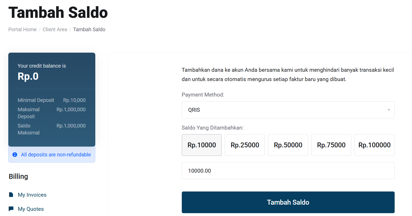 Pembayaran Otomatis: Invoice perpanjangan layanan akan otomatis terbayar selama saldo mencukupi.