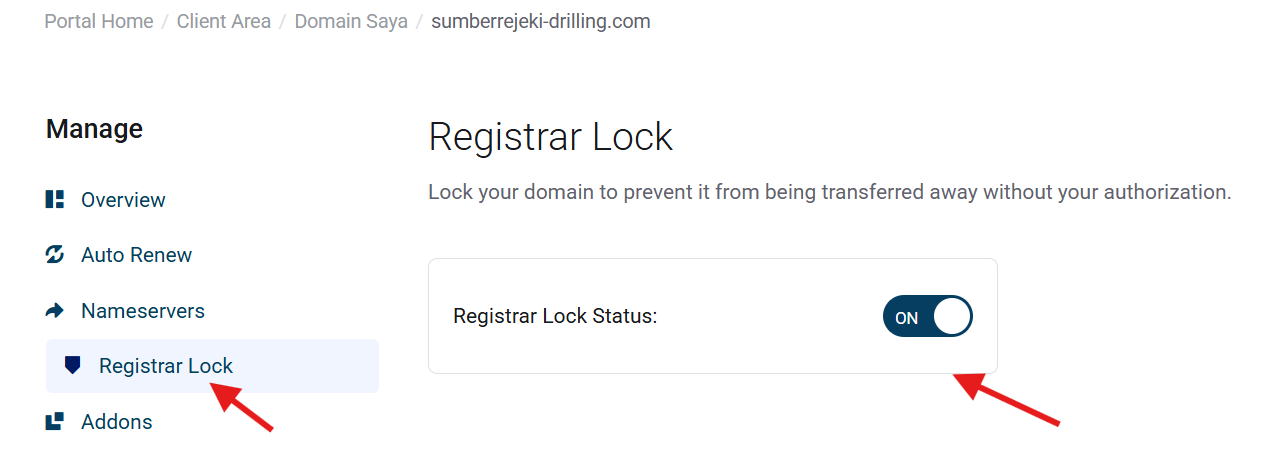 4. Di sidebar kiri, pilih menu Registrar Lock.