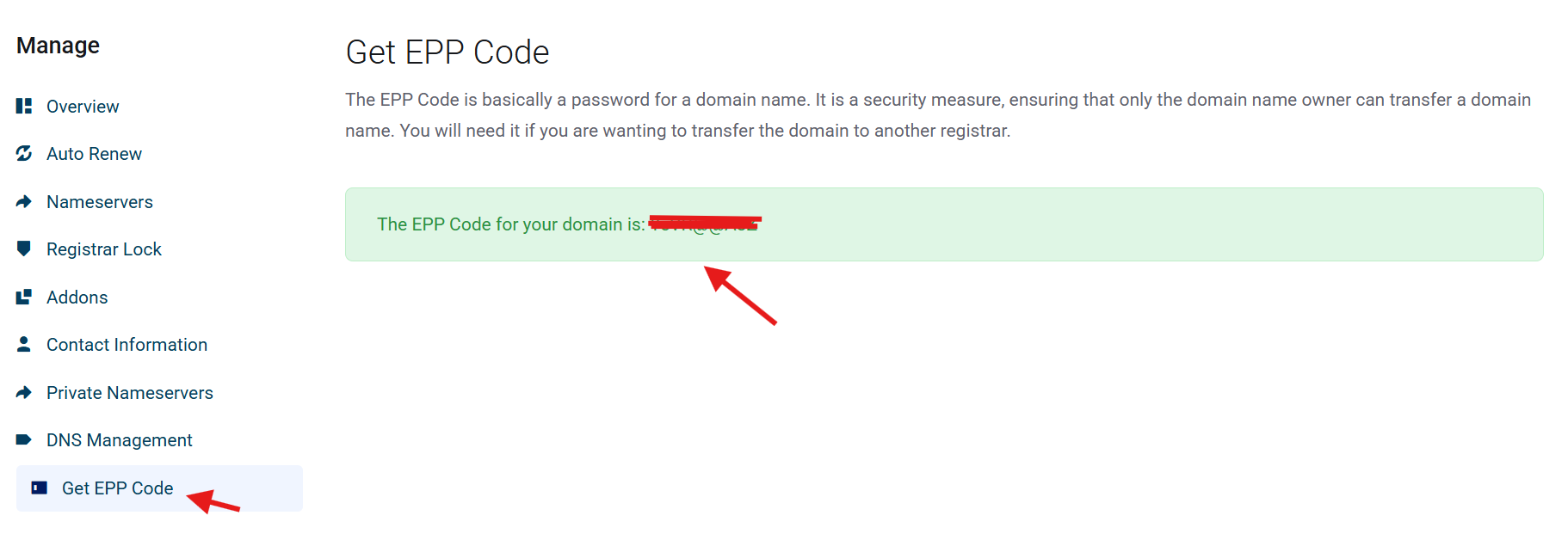 EPP Code adalah kode rahasia yang dibutuhkan oleh provider tujuan untuk menarik domain Anda.
